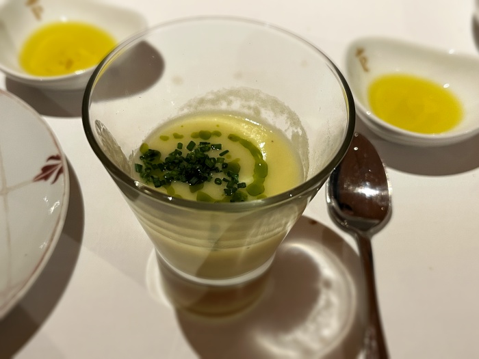 스타터로는 가리비(Scallop) 요리와 문어 요리(Pulpo)를 주문하였는데, 스타터가 나오기 전에 먼저 빵과 올리브오일 그리고 작은 수프가 나왔습니다.