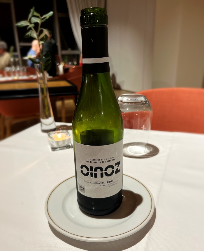 먼저 메뉴판을 보고 요리를 고르는 동안 와인을 한병 주문하였습니다. 산토 도밍고의 파라도르에서 너무나 맛있게 마셨던 Glorioso 와인이 있는지 물어보니, 말끔하게 차려입은 웨이터는 Gloriso는 없지만, 리오하 지방의 템프라니요(Tempranillo) 품종의 다른 와인을 추천해 주겠다고 합니다. 오이노스(Oinoz) 크리안사 2018 입니다.