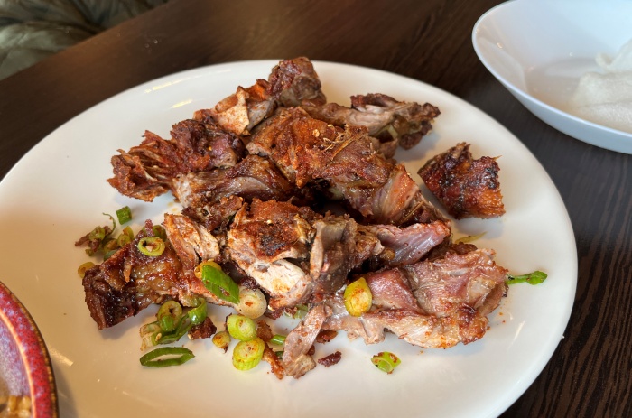 그렇게 오리고기를 한쌈 함쌈 즐기고 있노라면, 큰 살점을 발라내고 남은 작은 덩이와 뼈는 뜨거운 불에 바싹 튀겨진 다음 중국식 특유의 마라맛과 향의 양념이 뿌려진 요리로 재탄생해서 나옵니다. 캬, 이것 또한 별미입니다. 보통 중국에서는 남은 뼈로 죽이나 볶음밥, 볶음면 그리고 이렇게 튀김으로 요리를 선택할 수 있게 하는데 이 집은 마라양념튀김으로 해주었습니다.