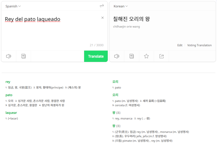저는 새로운 언어의 의미에 대해 흥미를 느끼는 타입이라서, 식당 이름의 뜻을 찾아보았습니다. 네이버 사전은 스페인어로 Rey는 '왕(King)'을, Pato는 '오리'를 그리고 Laqueado는 '옻/락스 칠을 하다'는 의미라고 설명을 합니다. 파파고 번역기도 비슷하게 해석을 해 놓았네요.