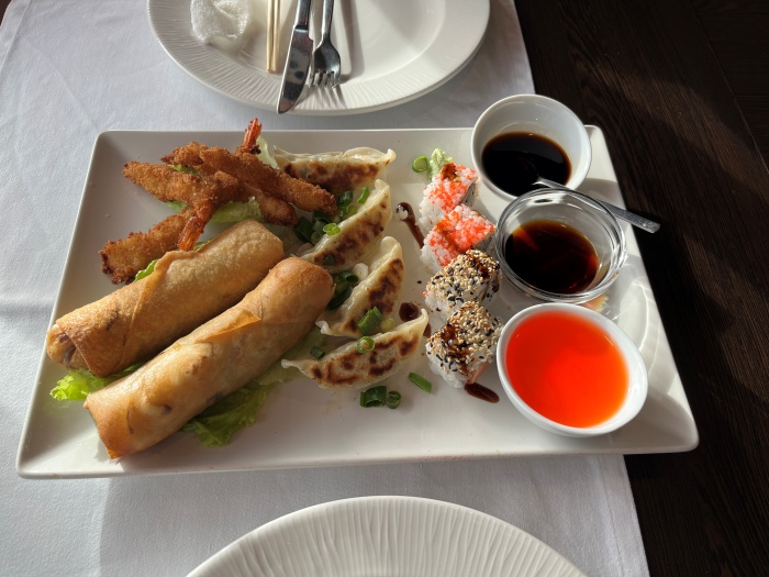곧바로 튀긴 춘권과 군만두, 새우튀김 그리고 캘리포니아롤이 나왔습니다. 캘리포니아롤은 퓨전이라고 할 수 있겠네요. 애피타이저로 나온 음식들이 맛이 다 괜찮았습니다. 특히 이 튀긴 춘권의 속은 양배추, 당근, 버섯 등의 채소로 가득 채워져 있었는데 하나의 사이즈가 엄청 크면서 맛도 괜찮았습니다.
