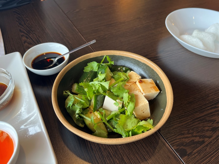 맨 처음에는 중국식당답게 차가운 요리(중국어로 냉채(冷菜, lěngcài))가 애피타이저로 나왔습니다. 두부와 오이 그리고 샹차이(향채)를 중국 특유의 간장 베이스 소스에 무친 중식 샐러드입니다.