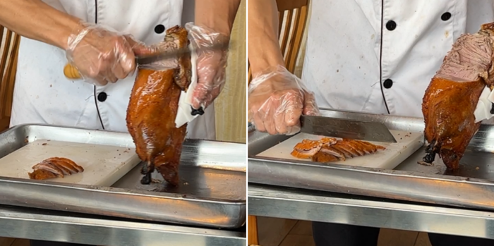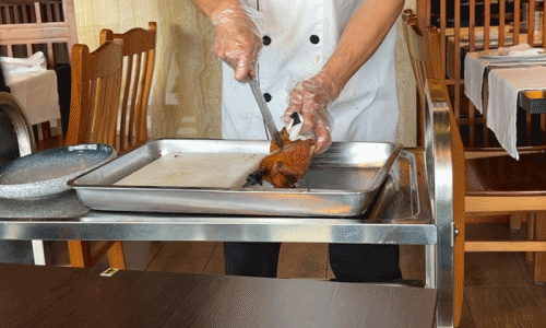 애피타이저를 다 먹어 갈 때쯤에는 주방장(?) 아저씨가 북경오리를 직접 가지고 나와서 요리된 오리를 보여준 후 그 자리에서 바로 플레이팅을 해주었습니다. 중국의 북경오리 전문 식당을 가면 볼 수 있는 모습인데, 이곳 스페인 순례길에서 보게 될 줄은 상상도 못 했습니다.
