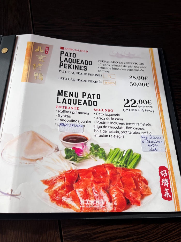 이 식당의 메인 요리라고 할 수 있는 북경오리는 단품으로도 주문 가능하고 세트로도 주문 가능했습니다. 단품 주문 시에는 북경오리 1마리에 50유로(EUR), 반(1/2)마리에 28유로(EUR) 였고요, 세트로 주문시에는 인당 22유로(EUR)이고 최소 2인 이상 주문이 필요했습니다.