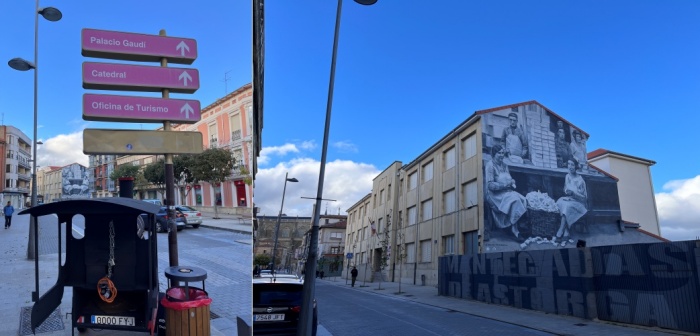 Palacio Gaudi라고 되어 있는 안내표지판을 따라 아스토르가 시내길을 걸어갑니다. 지금까지와는 다른 차원의 높은 완성도를 보여주는 건물 벽화도 나옵니다. 그리고 얼마 안 가서 동화책 속에서 나올 것 같은 예쁘장한 외관의 주교궁이 나왔습니다.