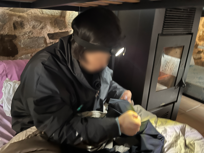 배를 든든히 채운 후 도미토리 베드 위에 누워서 휴식 시간을 갖습니다. 쉬는 동안 아내는 바느질을 합니다. 반짇고리는 언제 챙겨 온 것인지 모르겠지만, 잘 챙겨온 것 같습니다. 아내의 발에 물집이 잡혔을 때에도 유용하게 사용되었습니다. 이마에 찬 헤드랜턴이 절묘합니다.