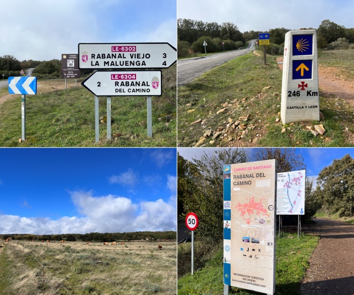 아쉬움을 뒤로하고 엘 간소 마을을 지나갑니다. 이제 라바날까지는 얼마 남지 않았습니다. 비가 내렸다가 그쳤다가를 반복합니다. 비도 오고 날씨도 추워 비옷을 바람막이 삼아 입은 채 걸어갑니다. 오늘의 목적지와 남은 거리를 알리는 표시석이 나옵니다. 순례길의 오른편으로는 소들이 풀을 뜯고 있습니다. 이윽고 오늘의 최종 목적지 라바날 델 까미노에 도착했습니다.