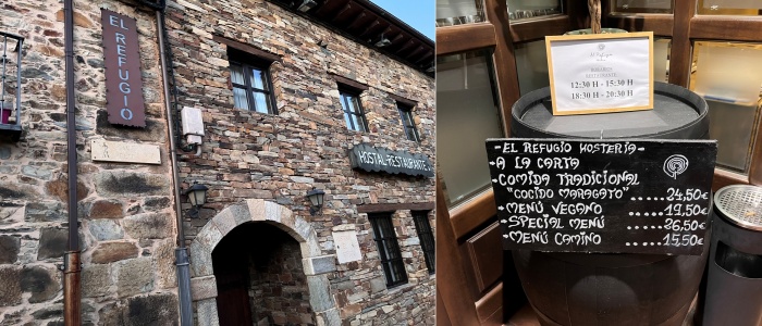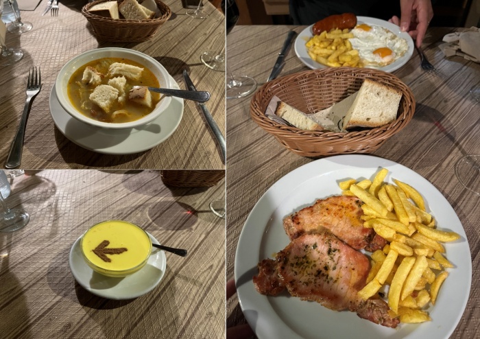 저희는 인당 15.5유로(EUR)인 순례자 메뉴(Menu Camino)를 주문했습니다. 음식은 애피타이저로 야채 수프와 빵이 나왔습니다. 빵과 스프 그 자체로는 평범하였지만, 빵을 떼어 따뜻한 수프에 넣어서 먹으니 특별한 요리가 된 듯한 느낌입니다. 쌀쌀한 날씨가 따뜻한 야채 수프를 더 맛있게 만드는 것 같았습니다.