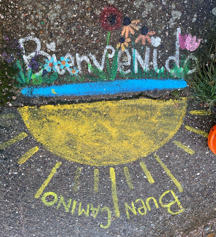 알베르게 입구 바닥에는 귀여운 페인팅이 되어 있었습니다. 페인팅은 숙소로 들어갈 때는 '환영합니다'라는 뜻의 '비엔베니도(Bienvenido)'가, 숙소를 나갈 때는 '즐거운(또는 좋은) 길 되세요'라는 '부엔 까미노(Buen Camino)'가 바로 보이도록 페인팅 되어 있었습니다. 오후 1시 정도에 도착을 했는데 오늘도 저희가 1등입니다. 저희는 어제 아스토르가에 이어 이틀 연속 1등으로 도착하는 기염을 토하고 있습니다^^.