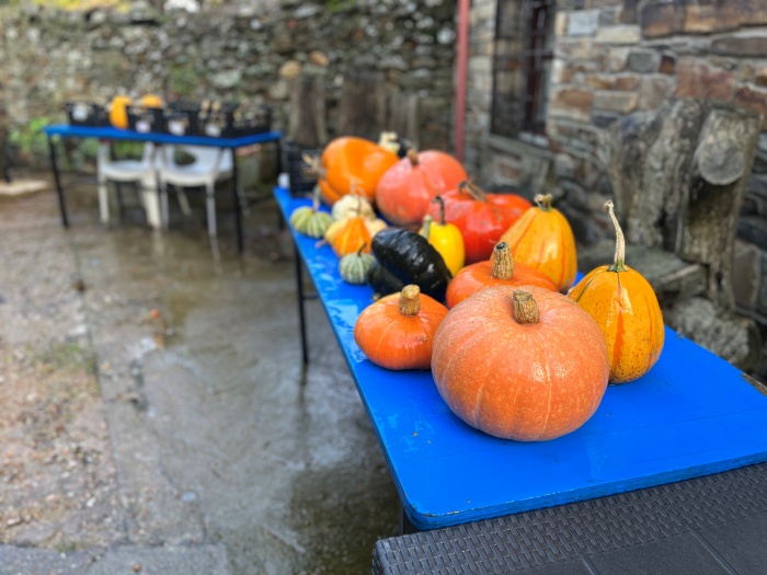 내일 아침에 간단히 먹을 요거트와 음료, 간식 등을 사러 마을 슈퍼마켓에 갔습니다. 부슬부슬 내리는 비는 그냥 맞으며 걸어가다가 빗발이 점점 거세어져 비옷을 꺼내어 입고 다시 걸어갑니다. 오후시간이라 그런지, 비가 와서 그런지 구글맵으로 검색해 보니 나오는 모든 슈퍼는 문을 닫았고 딱 한 군데 문을 연 곳이 있습니다. 슈퍼 앞에는 여러 종류의 호박들이 진열되어 예쁘게 진열되어 있습니다. 비를 맞아서 표면이 반짝반짝 빛나는 것 같습니다.
