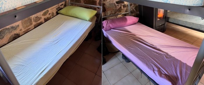 좋았던 것은 일회용 침대시트가 아니라 깨끗이 세탁을 한 천으로 된 침대시트와 베개시트가 제공된 점입니다. 저는 개인적으로 일회용 비닐 시트보다 세탁이 된 천 시트가 훨씬 더 좋았습니다. 제공되는 천 시트의 색상이 하얀색이 아니라 여러 가지 은은한 파스텔 톤의 색상이었던 것도 독특했습니다. 천 시트 외에 추운 사람들을 위해 담요도 같이 제공이 되는데 '베드버그(Bed bug)'에 대한 공포심으로 인해 저희는 담요는 사용하지 않았습니다.