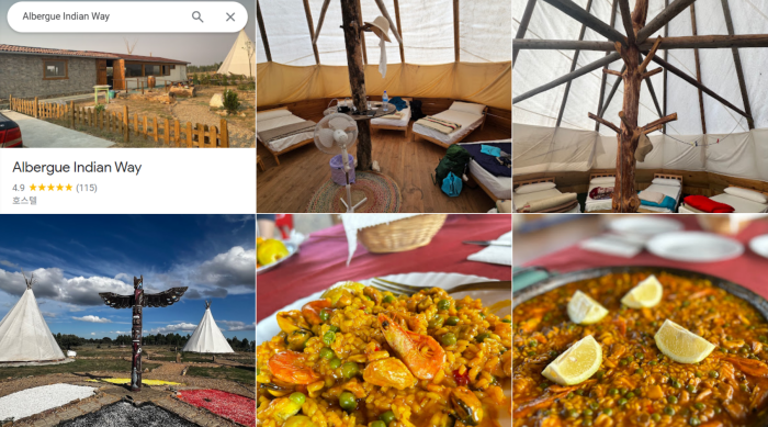 인디언의 길(Indian Way)이라는 이름의 이 알베르게는 순례길과는 다소 연관성이 없어 보이는 '인디언' 콘셉트의 인테리어를 가지고 있는 숙소입니다. '티피(Tipi 또는 Tepee)'라고도 불리는 '인디언 천막' 형태의 이 숙소는 순례길에서는 멀찍이 떨어져 있어서 자세히 볼 수는 없었지만 새로운 것에 대한 시도에 호기심을 느끼는 저에게는 굉장히 흥미로운 곳이었습니다.