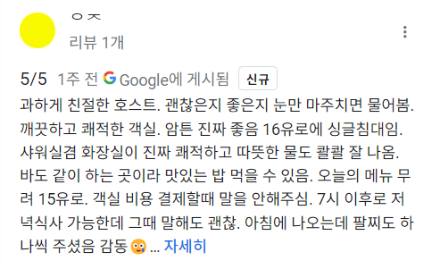밝은 미소로 저희를 맞아주셨고, 체크인 후도 지나가다가 눈만 마주치면 다가와서 '방은 괜찮은지, 필요한 것은 없는지' 미소 지으며 물어보셨습니다. 또 항상 '도움이 필요하면 얼마든지 말하고, 너의 집처럼 편하게 사용해, 내 친구야'라는 말로 마무리해주셨습니다. 이곳에서 1박을 하면서 이분께 이 말을 한 대여섯 번 정도는 들은 것 같았습니다. 이 글을 작성 중인 지금 구글맵에 들어가 리뷰를 보니 1주 전의 리뷰가 올라와 있습니다. 한번 보세요. 정말입니다.