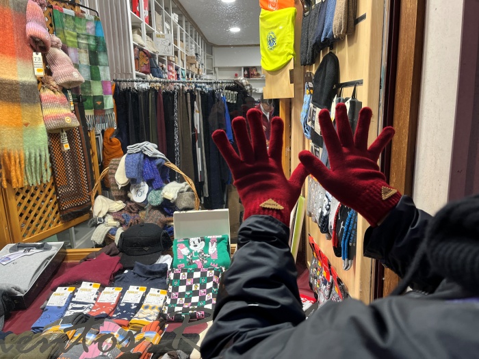 걷다가 장갑을 파는 상점이 나왔습니다. 빨간색의 이쁜 장갑이 하나 있었습니다. 걸을 때 손을 많이 시려하던 아내를 위해 장갑 한 켤레를 샀습니다.