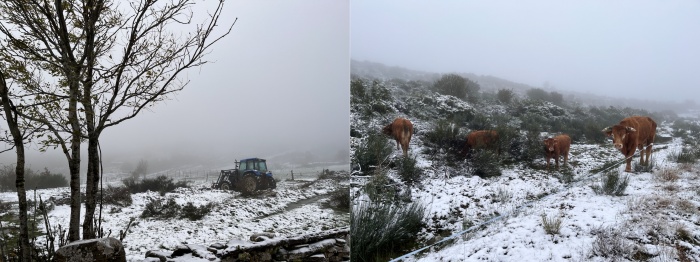 그 와중에 눈이 내려앉은 풍경은 아름다웠습니다. 조금 게으를 것 같은 농부의 것으로 보이는 트랙터가 눈을 맞으며 서있고, 다른 곳에서는 소들이 풀을 뜯고 있습니다.