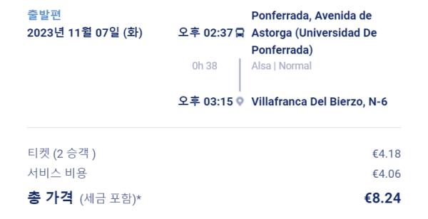 폰페라다에서 저희는 비야프랑카 델 비에르소까지의 버스요금은 오미오(Omio) 앱을 통하여 예매를 했고 요금은 2인 기준으로 모두 8.24유로(EUR)가 나왔습니다. 수수료가 절반입니다.