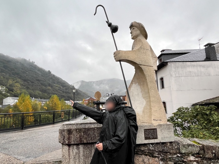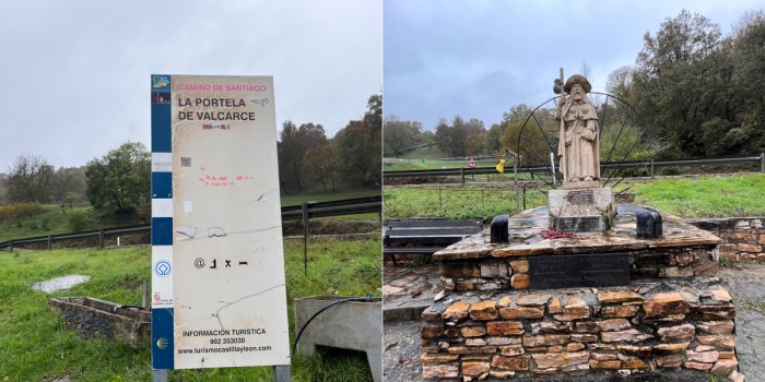 약 1시간 정도를 걸어가니 라 포르텔라 데 발카르세(La Portela de Valcarce) 마을이 나옵니다. 마을 입구에는 산티아고 형상의 석상이 세워져 있고, 그 발치에는 산티아고까지 남은 거리와 걸어온 길을 되돌아 가 론세스바예스까지 남은 거리가 표시되어 있습니다.