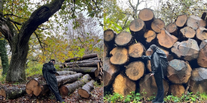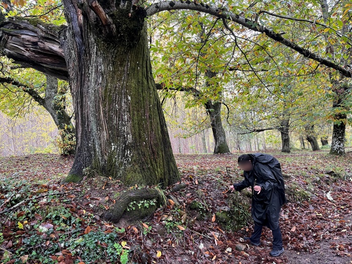 떨어진 밤송이 옆으로는 성인 3명은 나란히 손을 이어 잡아야 겨우 감싸안을 수 있을 법한 굵은 고목이 자리 잡고 있습니다. 아내는 오랜만에 보는 밤송이가 귀여워 잡아보고 싶으나 날카로운 밤송이 가시에 선뜻 잡을 수가 없습니다.
