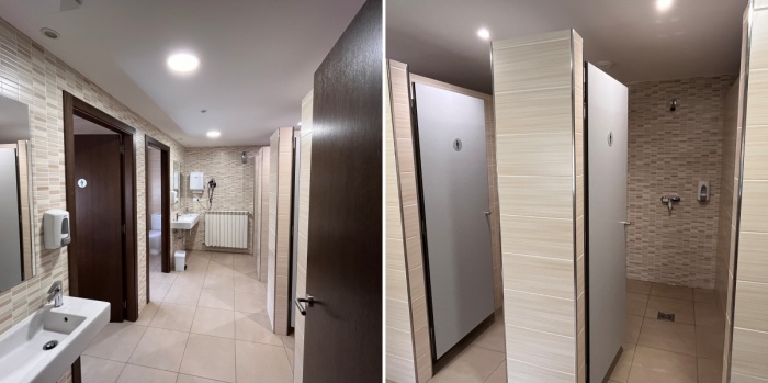 또 도미토리 안에 남녀가 구분된 공용 화장실과 욕실이 있었는데 깨끗했고 무엇보다 공간이 넓어서 아주 좋아 보였습니다. 또 침대가 있는 공간과 구분되는 문이 있고 그 안에 개별 문들이 하나씩 더 있어서 방음도 잘 될 것 같아 보였습니다.
