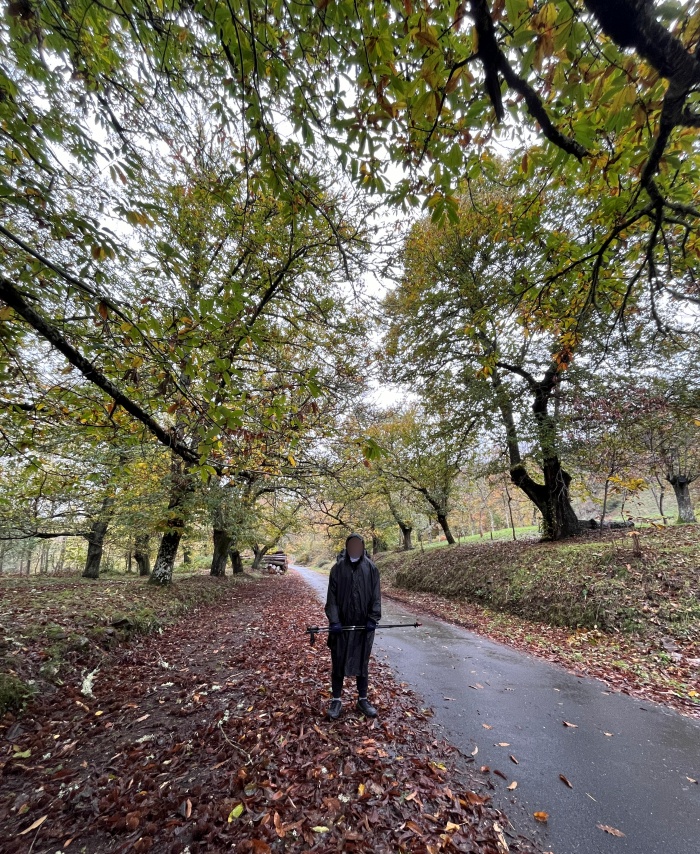 조금 더 걸어가니 순례길은 그 다음 마을인 트라바델로(Trabadelo)쪽으로 꺾어집니다. 마을로 들어가는 길이 한 폭의 그림과 같습니다. 가을 낙엽이 떨어진 길 좌우로는 수목들이 저희를 반기고 있었고, 낙엽들 사이사이에는 밤송이들도 있습니다. 거기에 비까지 더해 완연한 가을 느낌이 흠뻑 묻어나는 풍경입니다.