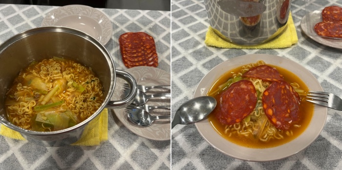 오늘은 그렇게 많이 걷지는 않았지만 비가 와서 정비할 것들은 많았습니다. 샤워를 하고 빨아야 할 옷가지들을 빤 후 널고 비옷과 신발도 잘 마르도록 펼쳐 놓았습니다. 저녁시간에도 계속 비가 와서 저희는 숙소에서 라면을 끓여 먹기로 하였습니다. 스페인 현지 슈퍼마켓에서 산 초리조를 반찬 삼아서 먹으니 색다른 별미입니다. 참고로 라면은 그전에 사놓았던 것입니다.