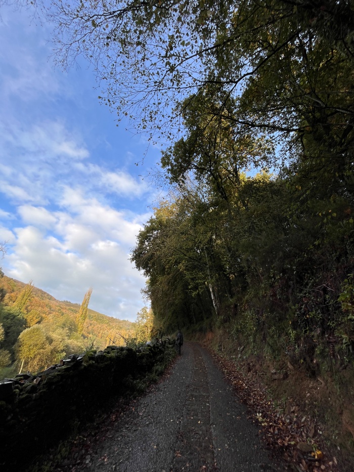 숙소 밖으로 나서니 밤새 내렸던 비는 그쳤고, 날씨는 맑고 화창합니다. 그래도 얼마 전까지는 비가 내렸던지 길바닥은 젖어있습니다. 작은 마을의 길을 따라 조금만 내려가니 오른쪽에 산씰(San Xil)로 향하는 것을 알리는 표지판이 나옵니다. 오늘 저희는 산씰(San Xil) 루트를 통하여 사리아로 갈 예정입니다.