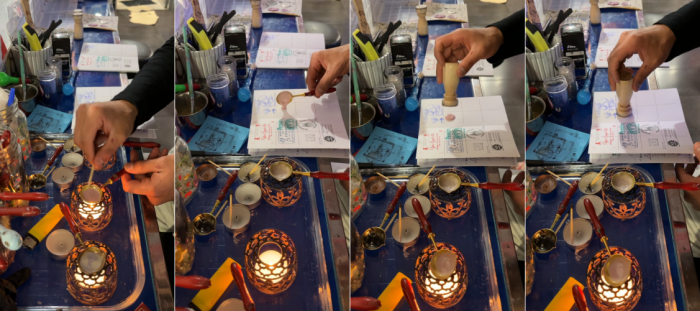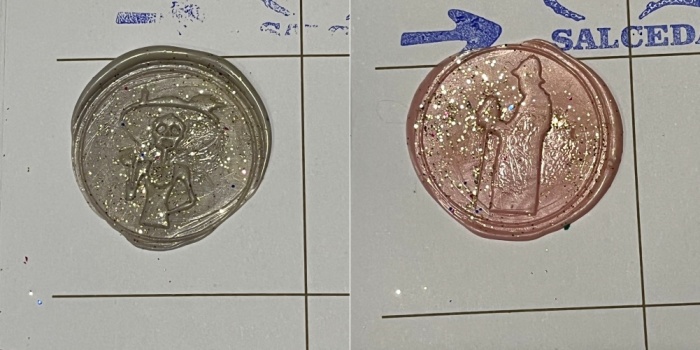 먼저 원하는 색상(Color)의 왁스를 선택하면 고체로 된 왁스를 불에 녹인 다음에 크레덴시알에 부은 뒤 도장으로 누른 뒤 굳을 때까지 기다립니다. 그리고 마지막으로 그 뒤에 반짝이를 뿌려줍니다. 도장의 모양은 두 가지가 있었습니다. 아내와 저는 서로 다른 모양의 쎄요를 각각 하나씩 받았습니다.