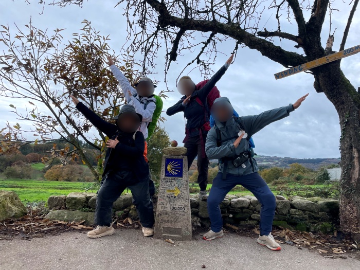 그 때 마침, 메시지 수신음이 들립니다. 패밀리들이 보낸 메시지인 것 같습니다. 확인해 보니 100km 지점을 통과했다는 인증 사진입니다. 저희가 며칠 전에 지나왔던 곳인데 이제 패밀리들이 도착한 것입니다. 사진으로 이렇게 소식을 보내주니 반갑습니다. 한 달 이상을 매일 걷고 있기 때문에, 사실 객관적으로 보면 꾀죄죄한 행색들이지만, 제 눈엔 모두들 이뻐 보입니다.