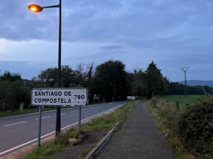아르수아 마을을 벗어나 본격적인 순례길로 들어섰습니다. 떡갈나무 숲 사이 오솔길을 따라 잠시 걸으니 프레곤또뇨(Pregontoño) 마을이 나옵니다. 마을 어귀에는 최종 목적지까지 남은 거리를 알리는 팻말이 하나 서 있습니다.