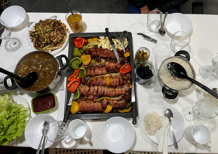 그리고 냄비로 지은 밥과 채소, 올리브조림에 산티아고 한인 마트에서 산 쌈장까지.