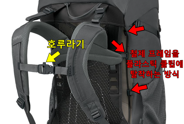 또한 제 배낭과 마찬가지로 척추 길이에 맞추어 하네스를 조절할 수 있게 되어 있습니다. 다만, 제 배낭은 벨크로(일명 '찍찍이')로 되어 있어 조절이 쉬웠던 반면 아내의 배낭은 철제 프레임으로 되어 있어서 여성이 혼자서 조절하기에는 무리가 있었습니다. 제가 조절하기에도 프레임이 단단해서 쉽지가 않았습니다.