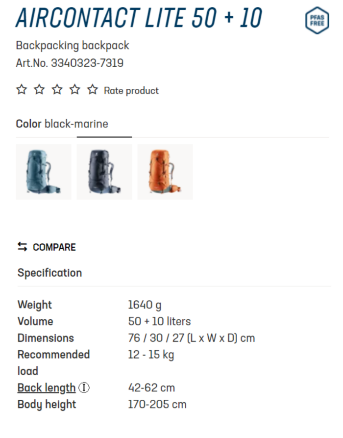 마지막으로 이 가방은 척추의 길이에 맞게 하네스를 조절할 수 있었는데 이 부분은 장기간 걸어야 하는 순례자에겐 매우 중요한 부분이라고 생각됩니다. 내 척추 길이에 맞게 조절할 수 있는 가이드는 도이터 홈페이지에서 제공하는데요, 위 스펙 이미지에서 Back Lengthⓘ라고 되어 있는 부분 보이시나요? 홈페이로 가셔서 거기를 클릭하면 바로 확인 가능합니다.