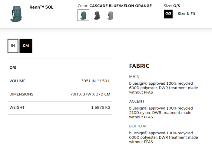 오스프리에서 나온 여성용 50리터(L) 백팩입니다.