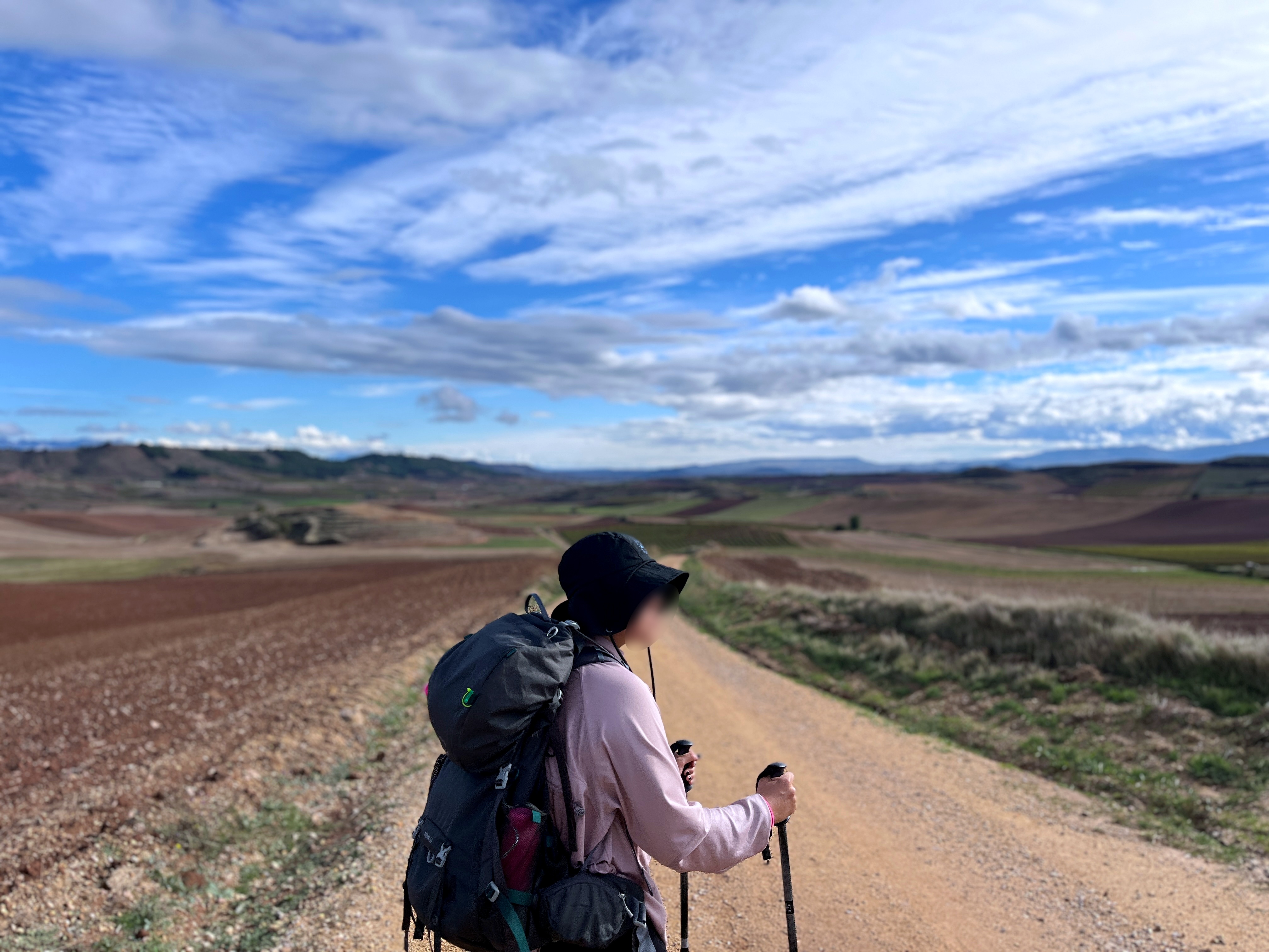 아소프라 마을을 빠져나오면 또다시 넓은 포도 농장이 시작됩니다. 아내의 발에 물집이 크게 잡혀서 걱정을 많이 했지만 경사가 거의 없는 길들이라서 그나마 수월하게 걸어갑니다. 걸으면서 토양의 색깔이 많이 붉다고 느꼈었는데 실제로 라 리오하 지방의 토양이 붉은 편이 맞다고 하네요. 스페인의 태양을 닮은 이 붉은 황토에는 충적토와 석회암이 많아서 잡초를 억제하는 동시에 포도나무의 성장을 촉진해 준다고 합니다. 라 리오하 지방이 포도주로 유명해진 이유가 여기에 있었나 봅니다. 울긋불긋한 토양과 푸른 하늘이 아름다운 조화를 이룹니다. 아내에게 멋진 사진을 하나 선물합니다.