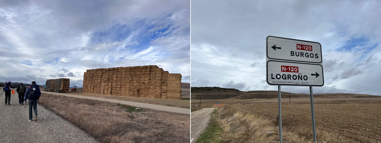 주변에는 엄청나게 큰 건초더미들이 쌓여있고, 큰 트럭들이 이 큰 건초더미들을 가득 싣고 지나가는 모습이 눈에 들어옵니다.  한국에서는 보지 못했던 신기한 풍경입니다.  조금 더 걸어가니 부르고스(Burgos)와 로그로뇨(Logrono)로 가는 N-120 도로 차량 통행 표지판이 나옵니다.  저희는 부르고스(Burgos)로 갑니다.  로그로뇨가 아무리 좋았다 해도 돌아갈 수 없습니다.  아니, 돌아가지 않습니다.  저희가 걷는 길은 산티아고로 흐르기 때문입니다.