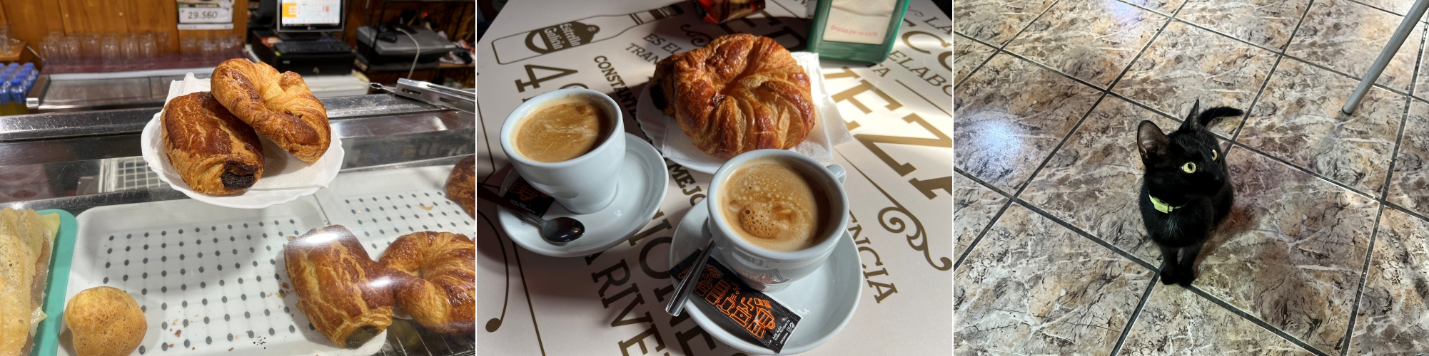 오후 1시가 다 되어 갑니다.  점심을 먹지 않고 걸었더니 출출합니다.  오늘 아침 그라뇽에서 출발해서 저희 앞서 걷고 있는 '안티모' 동생과 '미카엘라'양이 크로와상과 라떼가 맛있다고 하는 카페를 하나 알려줘서 그곳에서 잠깐 쉬어 가기로 합니다.  웬만하면 실패하지 않는 '나폴리따나'와 '크로와상' 그리고 '까페꼰레체(Café con leche)'를 시킵니다.  노란 눈동자에 새까만 고양이가 다가와 저희 테이블 앞에 자리를 잡고 앉습니다.  말을 걸어봅니다.  안녕?  네의 이름은 '네로'니?