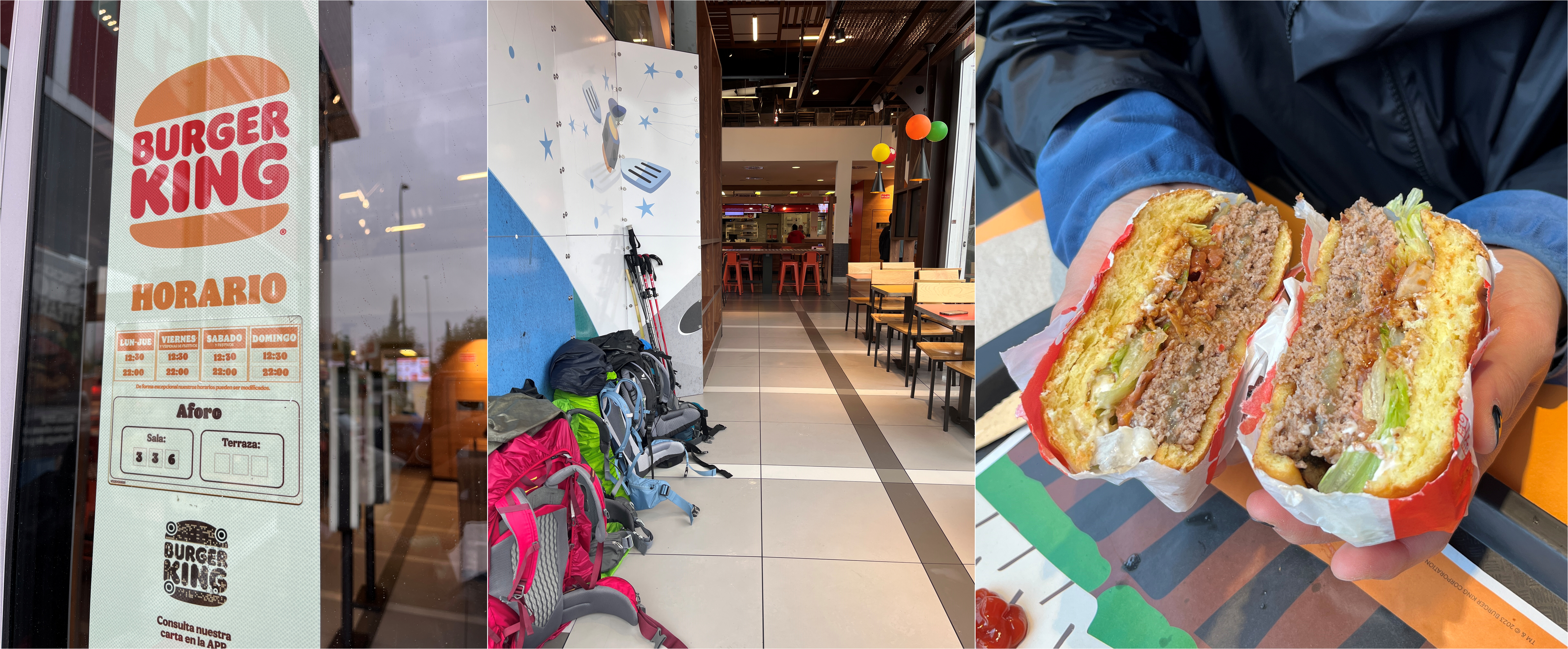 부르고스로 들어가는 길에 하늘은 다시 비를 뿌리기 시작합니다. 공장지대가 끝나갈 때쯤 시간을 보니 낮 12시 30분이었습니다. 마침 그 곳에 큰 버거킹(Burger King) 매장이 있어서 비도 피할 겸 그곳에서 점심식사를 하기로 합니다. 또 마침 버거킹 오픈 시간이 12시 30분이었습니다. 그렇게 부르고스 버거킹 첫 손님으로 들어간 저희는 젖은 비옷을 벗어서 털어놓고는 한쪽에 자리를 잡고 앉았습니다. 다들 먹고 싶은 버거나 와퍼 세트를 시켜 앉아 오랜만의 패스트푸드 맛을 봅니다. 맛있습니다. 배부르게 충분히 먹고 휴식한 후 부르고스 시내 최종 목적지, 숙소를 찾아 걸어 들어갔습니다.