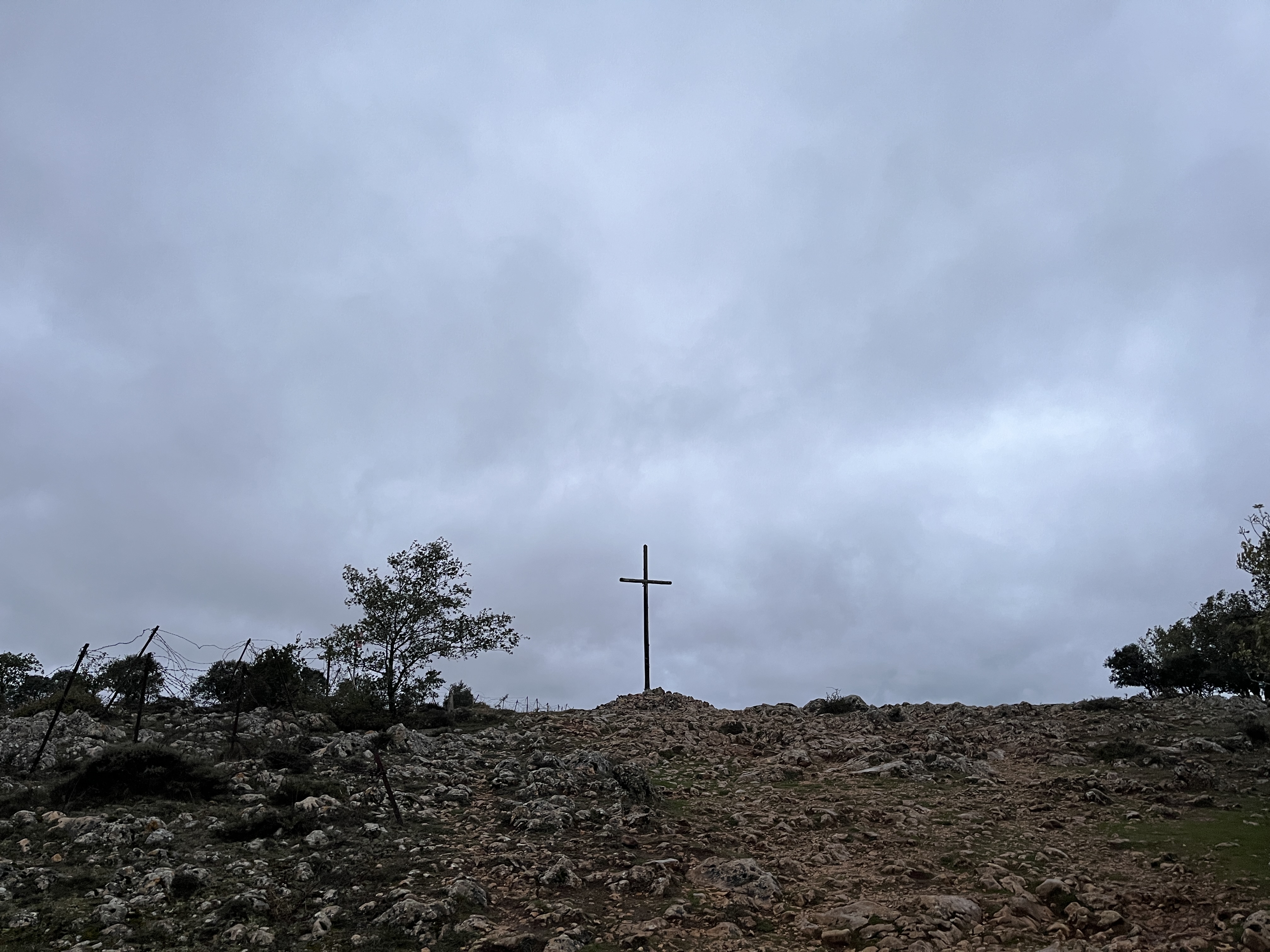 아헤스에서 출발해서 처음 나오는 아따뿌에르까(Atapuerca) 마을을 빠르게 지나 걸어 나갑니다. 마을을 벗어나면서 오르막길이 시작됩니다. 나지막한 언덕길이었지만 배낭을 메고 상하의 모두 비옷을 껴입은 채로 걸어가자니 힘이 들었습니다. 몸 안의 열기가 비옷으로 인해 빠져나가지 못해 땀으로 몸이 젖어드는 느낌이 듭니다. 열기를 식히기 위해 비옷의 지퍼를 여니 찬바람이 파고 들어와 금세 추워집니다. 언덕길의 정상이 가까워 올수록 길은 점점 굵은 돌덩어리가 박힌 걷기 힘든 길로 변하고 언덕 위에는 십자가 상(Cruz de Atapuierca)이 나타납니다.