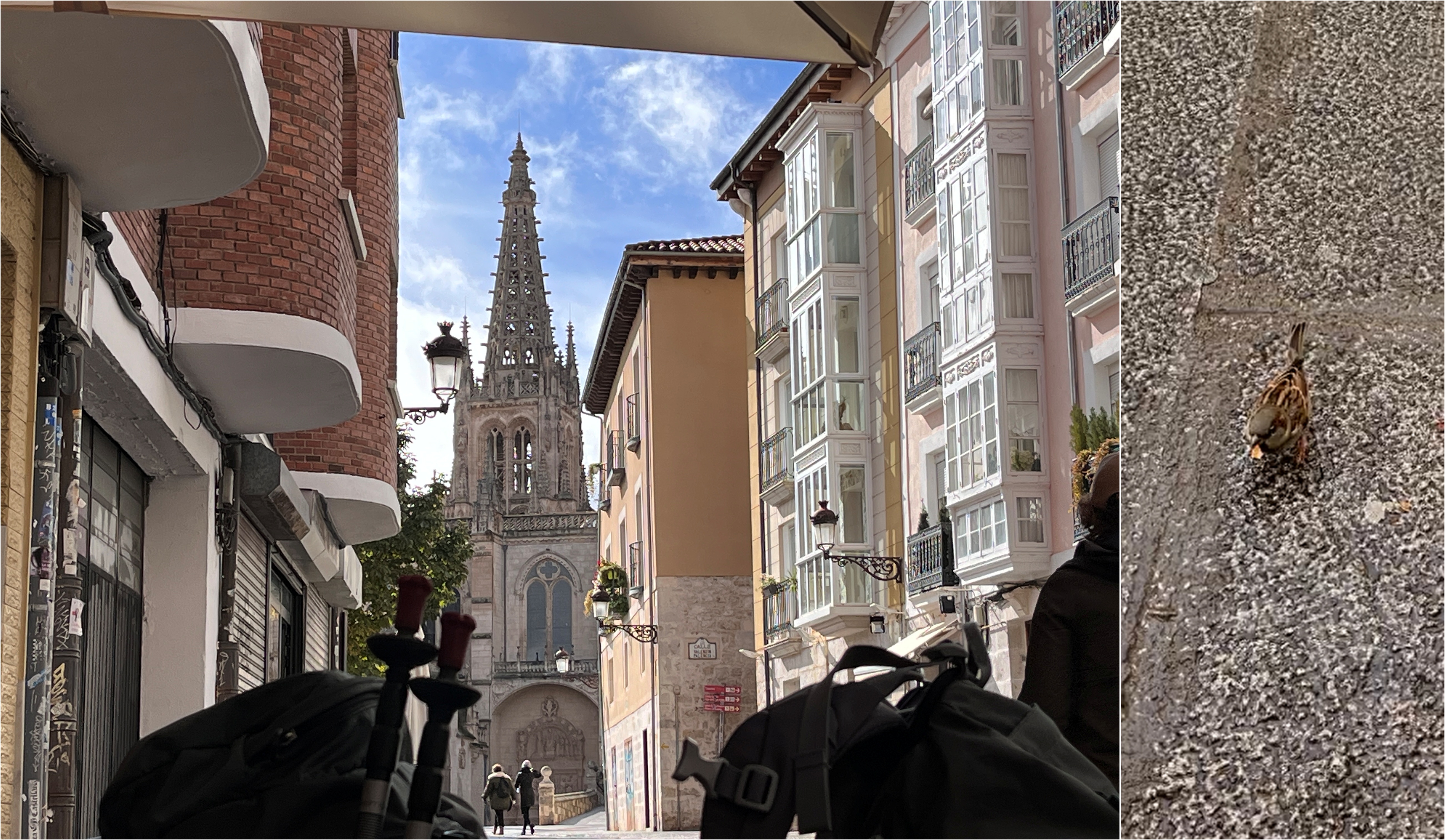 오전 11시가 가까워올 무렵 미사를 보러갔던 패밀리들이 돌아오고, 마침 체크아웃을 알리는 듯 방을 청소하는 직원분이 올라오십니다. 짐을 챙겨 숙소를 나와 도보로 약 10분 거리에 있는 부르고스의 공립 알베르게로 향합니다. 정문에는 오후 2시에 오픈한다는 문구가 적혀있습니다. 아침식사를 든든히 먹어서 배가 많이 고프지는 않았습니다. 근처 타파스 바에 들러서 간단히 점심을 먹고 와서 알베르게 반대편에 있는 La Babia 카페의 길가 테이블에 자리를 잡고 앉아서 커피를 마시며 오후 2시 알베르게 오픈을 기다립니다. 하늘을 가득 덮고 있던 컴컴한 구름이 걷히고 밝은 태양빛이 비추어 내리기 시작합니다. 토실토실해 보이는 참새들이 지저귀며 주변을 날아다닙니다. 먹고 있던 빵 부스러기를 주변에 조금 뿌리자 이내 몰려들어와 조심스레 빵조각을 입에 물고 날아갑니다.