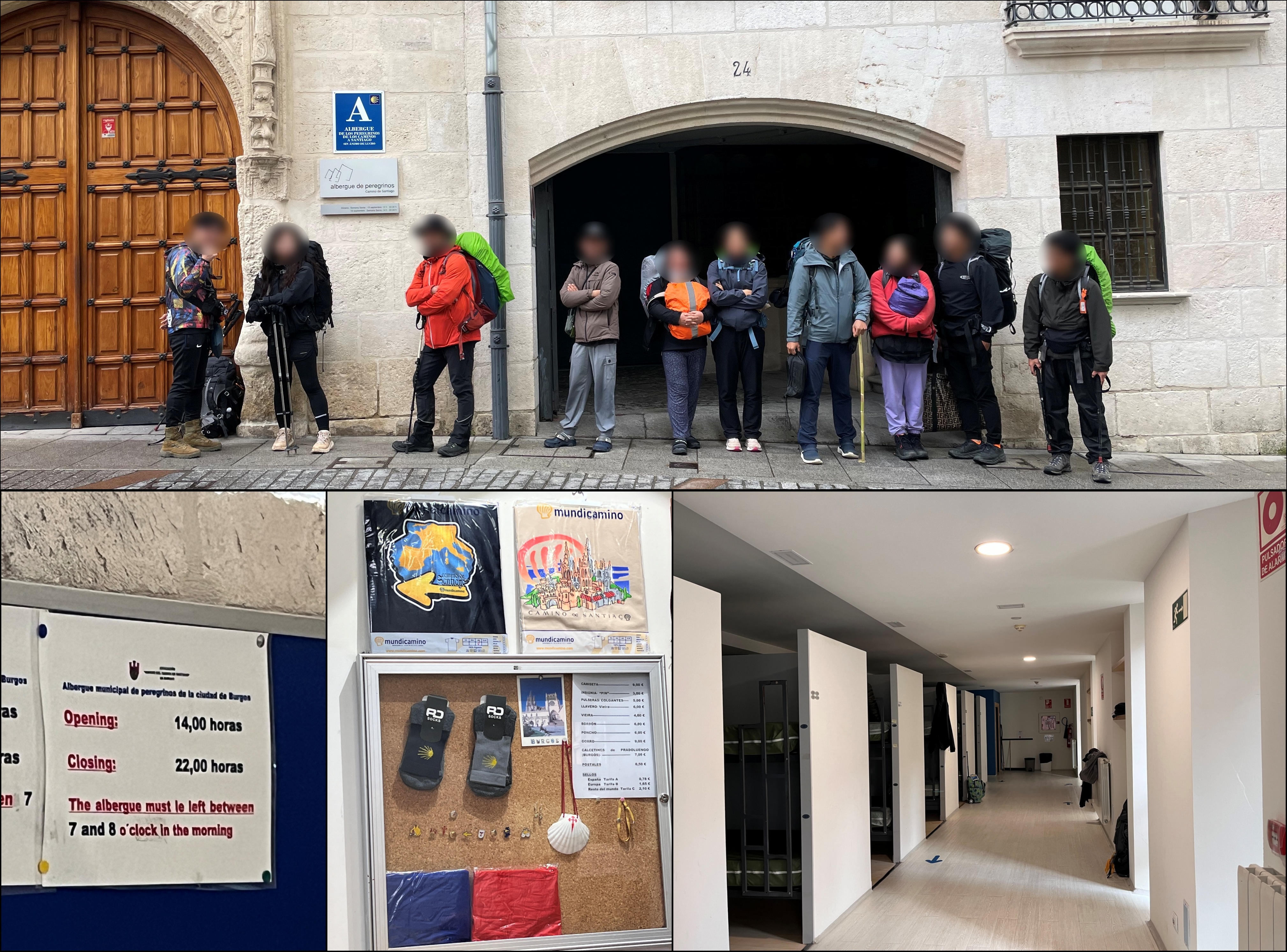 *부르고스 공립알베르게(Albergue Municipal de Peregrinos de Burgos): 전체 도미토리를 다 돌아보진 못했으나 굉장히 큰 규모의 알베르게로 보였습니다. 남녀 구분이 없는 도미토리에 벙커베드(2층 침대)가 줄지어 있고 도미토리 내부에 남녀 구분이 없는 샤워실과 화장실이 안쪽 벽면을 따라 길게 일렬로 배치되어 있습니다. 1층에 공용 주방이 있고 공간이 넓어서 많은 사람이 동시에 사용이 가능했습니다만, 음식을 요리해서 먹을 수는 없는 구조였고 대신 전자레인지에 음식을 데워먹는 정도와 설거지용 싱크대 정도가 비치되어 있었습니다. 다음날 아침 8시 전에는 무조건 퇴실을 해야하며, 8시에도 퇴실하지 않고 늦장을 부리는 순례자들은 눈칫밥을 좀 먹어야 했습니다.