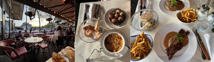 이제 파리 시티 투어를 마무리하고 석양이 보이는 테라스가 있는 멋진 분위기의 식당에서 저녁식사를 했습니다. 말로만 듣던 달팽이 요리 에스카르고(Escargot) 와 양파 수프(Onion Soup)를 애피타이저로 먹고, 메인으로는 소고기 스테이크를 먹었습니다. 앞으로 저희는 먼 길을 가야 하니 든든하게 먹었습니다.ㅎㅎ 스테이크는 평범했지만, 달팽이 요리와 양파 수프는 꼭 한번 드셔보시길 추천합니다. 웬만한 식당엔 위 요리는 다 있을 겁니다. 맛있었습니다.