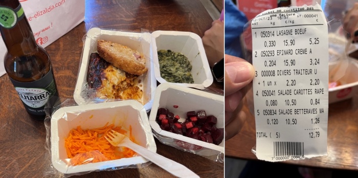 저희들의 숙소인 GITE Compostela 앞에 저희가 원하던 식료품 점이 하나 있었습니다.  라자냐와 시금치로 보이는 채소를 크림소스에 요리한 음식 그리고 코돈블루(Cordon Bleu, 네이버에 검색하니 코르동블뢰라고 합니다.)라고 하는 돈까스 1조각과 피클 2가지를 샀습니다.  숙소로 돌아와 1층의 공용 거실 테이블에서 식사를 했습니다.  미국에서 온 Ella라는 아가씨가 혼자 앉아서 책을 읽고 있네요.  몇 마디 인사를 나누고 저희는 반대편 공간의 테이블에 앉아서 식사를 합니다.  대단한 음식들은 아니었지만 하루 종일 제대로 된 식사를 못해서 그런지 정말 맛있게 먹었습니다.  무엇보다 식당에 가서 먹는 것에 비해서 비용이 저렴했습니다.  음료까지 모두 합해서 12.79유로(EUR)가 나왔네요.