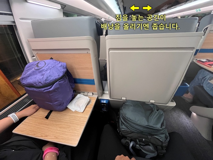 자리를 잡고 열차에 앉았습니다.  아쉽게도 역방향입니다.  제가 알아본 바로는 티켓 예매시 좌석 지정은 안되고 랜덤으로 배정이 되는 것 같습니다.  2등석이라 그런지 좌석 위 짐을 싣는 공간은 배낭을 올리기엔 협소해 보여 그냥 좌석 앞에 내려놓고 갔습니다.