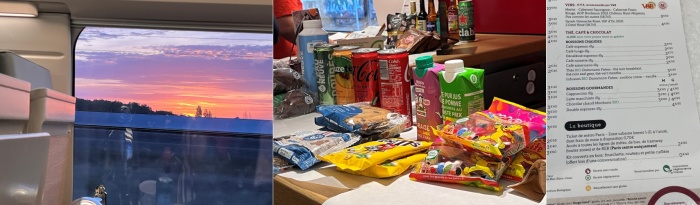 호텔에서 약 7분 정도 걸어가면 나오는 Glaciere 지하철역에서 지하철을 타고 가니 10분 만에 몽파르나스 역에 도착합니다.  기차역 도착시간이 아침 6시 정도로 이른 시간이었으나 역사는 사람들로 가득차 있었습니다.  어디론가 가기 위해 기차를 기다리는 사람들로 매우 분주하고 붐볐습니다.  깜짝 놀랐어요.  이 시간에 이렇게 사람이 많을 줄은 몰랐거든요.  역 내에 있는 대부분의 카페는 샌드위치나 커피를 사려는 사람들의 줄이 길게 늘어져 있었습니다.  저희도 TGV 열차를 기다리며 샌드위치와 커피로 간단히 아침식사를 해결했어요.  참고로 카페에는 앉아서 먹는 공간이 없고 모두 테이크아웃입니다.  아마도 모두 다 아침을 들고 기차를 타나 봅니다.  저희는 역 내에 공용으로 사용하는 의자/벤치 같은 곳을 찾아가서 먹었습니다.