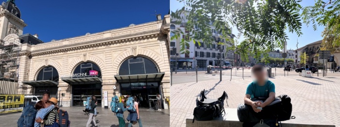 버스 출발 시간까지는 1시간 가까이 더 기다려야 했습니다.  역 내에 있는 슈퍼에서 산 샌드위치로 간단히 점심식사를 합니다.  그리고는 햇살이 너무 좋아서 역사 밖으로 나와 벤치에 앉았습니다.  쾌청한 날씨가 좋습니다.  그렇지만 10월 중순의 프랑스 남부 햇살은 여전히 뜨거웠습니다.  잠깐 앉아 있으니 뜨거워져서 그늘을 찾아 자리를 옮깁니다.  바욘 역 앞에는 저희와 같이 생장 피에드포르로 갈 것으로 보이는 배낭을 멘 사람들이 많이 보였습니다.  괜히 반가운 마음이 들었습니다.