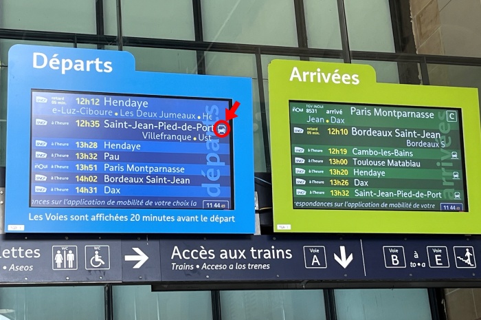 바욘 역 출입구로 나와 전광판을 보니 생장 피에드포르까지 가는 열차는 버스로 대체가 된 듯합니다.  버스 출발시간은 오후 12시 35분이라고 나오네요.  역무원으로 보이는 분에게 물어보니 버스를 타는 곳을 손가락으로 가리키며 알려주십니다.  역사를 나가면 눈에 보이는 가까운 곳에 있네요.  버스를 탑승하는 정확한 위치는 없었던 것 같습니다.  그냥 출발시간이 가까워오면 배낭을 멘 사람들의 줄이 길게 생기기 때문에 못 찾을 일은 없을 것 같습니다.