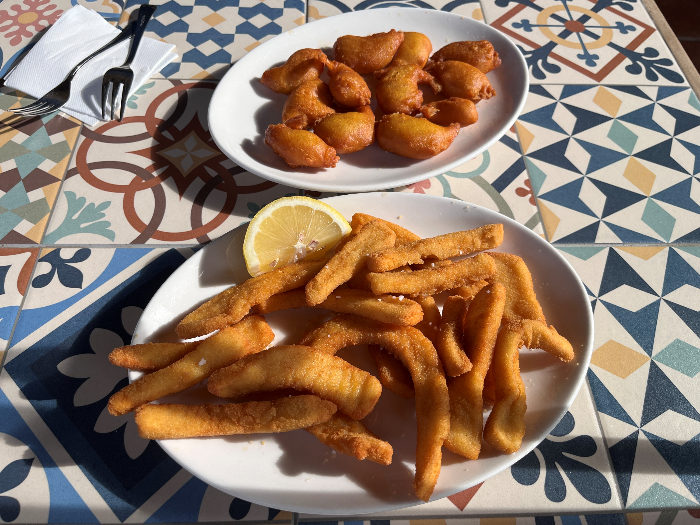 우떼르가 마을에 도착한 시간이 오전 11시 30분 정도여서 이 곳에서 점심식사를 간단히 하기로 합니다. 괜찮아보이는 카페로 들어가서 야외 테라스에 앉아서 음식을 주문하였습니다. 깔라마리 튀김과 새우 튀김을 시키고 시원한 맥주를 한잔씩 마셨습니다. 사진으로는 평범해 보이지만, 순례길에서 갖는 식사는 거의 항상 대부분 지상 최고의 요리였습니다. 특히 이 집은 튀김반죽에 간을 잘 해 놓아서 그런지 굉장히 맛있었습니다ㅎㅎ.