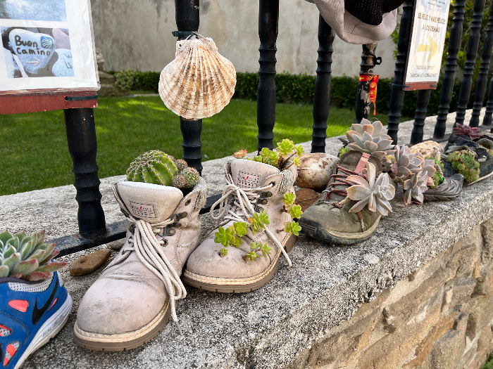 언덕을 내려오니 우떼르가(Uterga) 마을이 나왔습니다.  어느 집 담장 앞을 보니 순례자를 의미하는 가리비와 배낭이 걸려있고 순례자들이 신었을 법한 신발들을 화분 삼아서 여러가지 선인장 식물들이 심겨져 있습니다.  나도 나중에 이런 정원이 있는 집에 살 수 있게 되면 이렇게 꾸미면 어떨까 생각해봅니다.