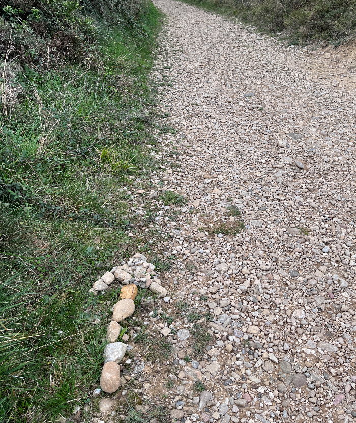 길을 걷다보면 순례자들을 위한 노란색 화살표 표시가 필요할 때마다 적절히 나타나 순례자들의 길을 인도해 줍니다.  특히 길이 두 갈래로 나뉘어 지거나 헷갈릴 수 있는 구간에는 항상 있었던 것 같아요.  그렇지만 그래도 간혹 표시가 없는 부분도 있긴 있습니다.  하지만 그럴 때는 먼저 이 길을 걸었던 사람들이 적절한 표시를 남겨두어 뒤따라 걸어오는 순례자들의 발걸음을 인도합니다.  여러분도 순례길을 걸으시면 길거리의 돌들로 만들어 놓은 이쁜 돌맹이 화살표를 종종 만나시게 될 겁니다.  개인적으로 이 화살표는 배려와 섬김의 화살표라고 생각됩니다.  아내도 길 옆의 작은 돌맹이 하나를 주워와 배려와 섬김에 동참합니다.  그리고 다시 길을 걷습니다.