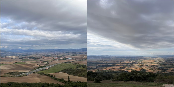 팜플로나 시내를 빠져나와 본격적인 순례길로 들어섭니다.  떠오르는 해를 등지고 걸어가며, 어제 팜플로나에서 '미카엘라'양이 준 초코빵을 베어물고 입 안 가득히 퍼지는 스페인 초코릿의 맛을 음미합니다.  10월 중순이라 그런지 추수를 끝낸 것으로 보이는 드넓은 논밭이 눈앞에 펼쳐집니다.